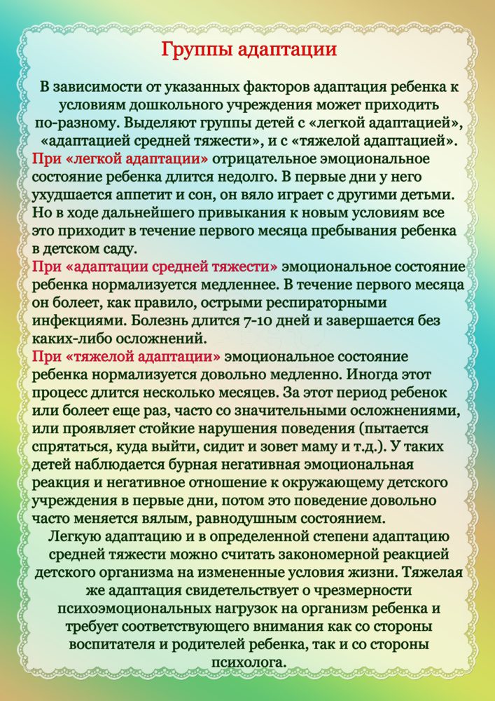 Адаптационный период – серьезное испытание для малышей раннего возраста: из знакомой семейной обстановки он попадает в новые для него условия, что неизбежно влечет изменение поведенческих реакций ребенка, расстройство сна и аппетита. В возрасте 1-3 лет ребенок имеет ряд специфических возрастных возможностей. Этот период характеризуется обостренной чувствительностью к разлуке с матерью и страхом новизны. Поступление в детский сад часто вызывает у ребенка стресс. Это обусловлено тем, что в корне меняется не только режим дня, привычный с рождения, но и окружающая ребенка среда, появляется большое количество незнакомых людей. Приспособление организма к новым условиям социального существования, новому режиму сопровождается изменением поведенческих реакций ребенка, расстройством сна, аппетита. Семья ребенка также требует какое-то время для того, чтобы приспособиться к новым жизненным обстоятельствам.