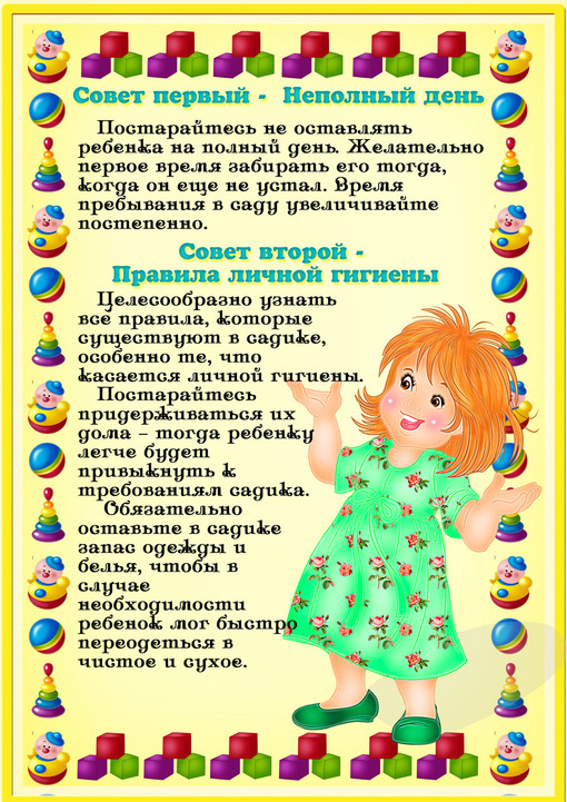— Заранее попытайтесь приблизить режим своего ребенка к режиму детского сада, постепенно измените его рацион так, чтобы он был более похож на питание в саду. Выясните, в какое время вам лучше всего придти в первый день и какой режим посещения будет в первые дни. В нашем детском саду в первый день вам предложат привести ребенка к 8.00. В последующие дни время пребывания ребенка в группе будет увеличиваться в индивидуальном порядке, предложенном воспитателем.